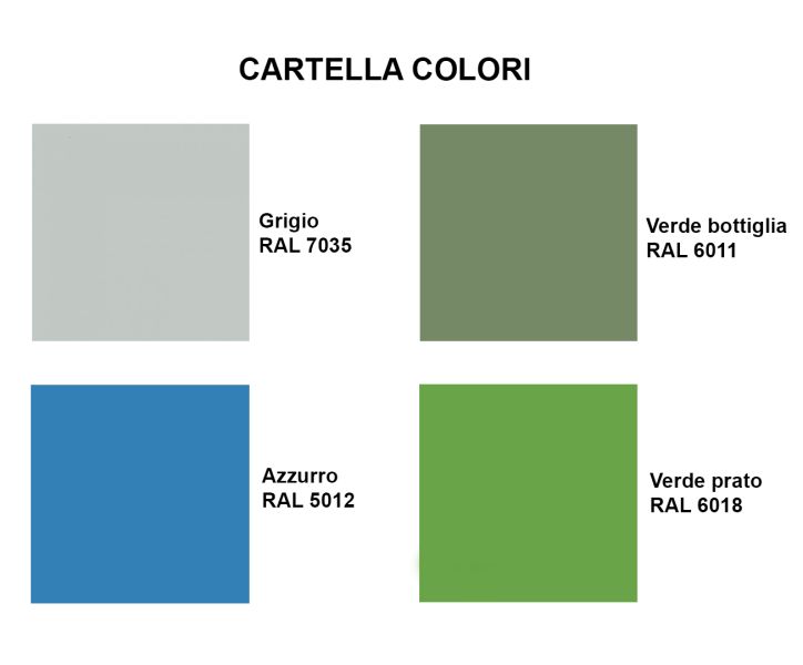 Colore: struttura grigio, azzurro, verde bottiglia o verde prato a scelta dal menù a tendina; ante grigio, azzurro, verde bottiglia o verde prato a scelta dal menù a tendina