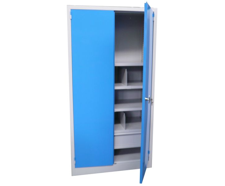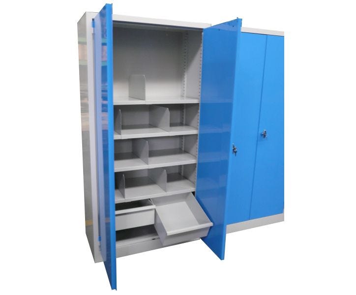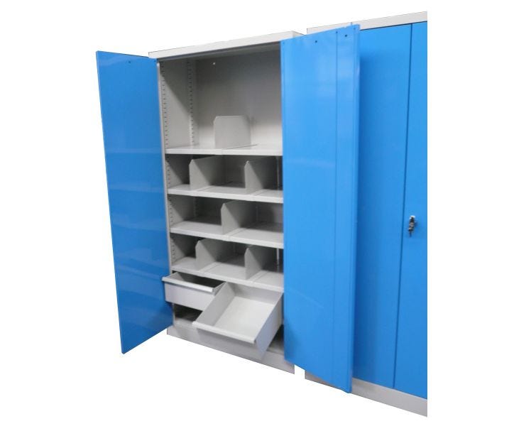 Armadio monoblocco per officine in lamiera con ante battenti e interno con ripiani, cassetti e divisori cm. 100x50x195h