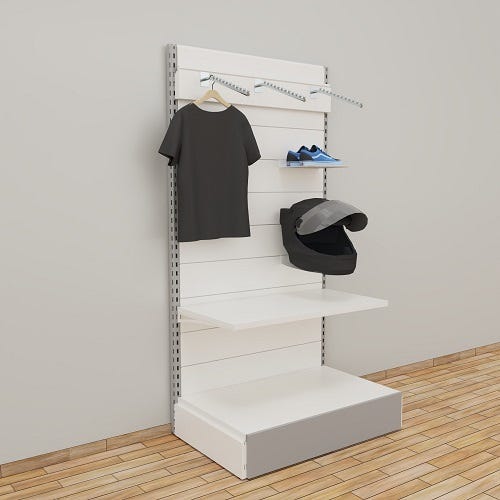 Nel fashion conta la presentazione: gli scaffali per negozi abbigliamento devono mettere in risalto capi e accessori senza appesantire lo sguardo. Strutture sottili, finiture neutre e ripiani regolabili aiutano a costruire capsule per colore o tema, con spazi dedicati a piegati, box e calzature. L’integrazione con pannelli dogati e mensole trasparenti crea nicchie scenografiche, mentre gli zoccoli coordinati rifiniscono la base espositiva. Le linee a parete di scaffali verniciati e centro stanza presenti nel catalogo consentono allineamenti lineari o isole, secondo il layout voluto dal visual merchandiser.