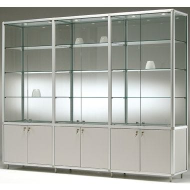 - base della vetrina in legno melaminico verniciato colore silver di altezza 9cm. dotata di rotelle a scomparsa per agevolare gli spostamenti